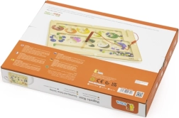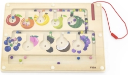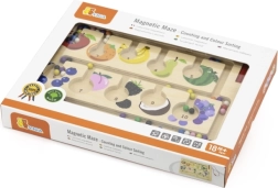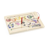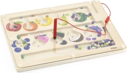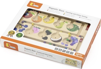 Ten wysokiej jakości drewniany magnetyczny labirynt to świetna zabawka edukacyjna wspierająca zręczność dziecka. Dzieci za pomocą magnetycznego rysika przesuwają kolorowe kulki wyznaczonymi ścieżkami, sortują je według kolorów i dopasowują do obrazków owoców lub liczb. Zabawka wspiera logiczne myślenie, koncentrację oraz koordynację ręka–oko.
