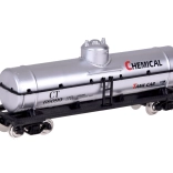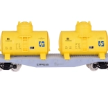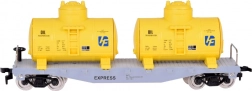 Wagon platforma z dwiema żółtymi cysternami oraz oddzielna srebrna cysterna CHEMICAL. Obrotowe osie umożliwiają płynne pokonywanie łuków.