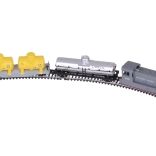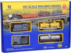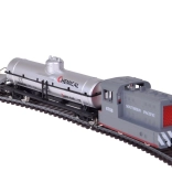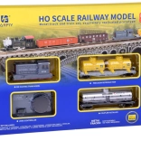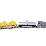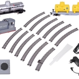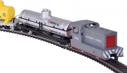 - Kompletna zawartość: lokomotywa SOUTHERN PACIFIC, wagon platforma z dwiema żółtymi cysternami, srebrna cysterna CHEMICAL, łuki 30° (11 szt.), łuk zasilający, zasilacz i przewód połączeniowy.