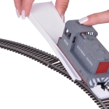 W zestawie znajdują się metalowe tory z plastikowymi podkładami, precyzyjnie grawerowane dla realistycznego wyglądu. Modułowy system wsuwanych szyn trzyma się mocno razem i można go łączyć z innymi zestawami tej samej serii. Nie brakuje też praktycznego naprowadzacza/„wkolejacza” do łatwego ustawiania pojazdów na torze.