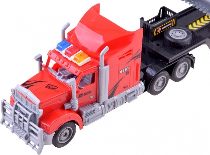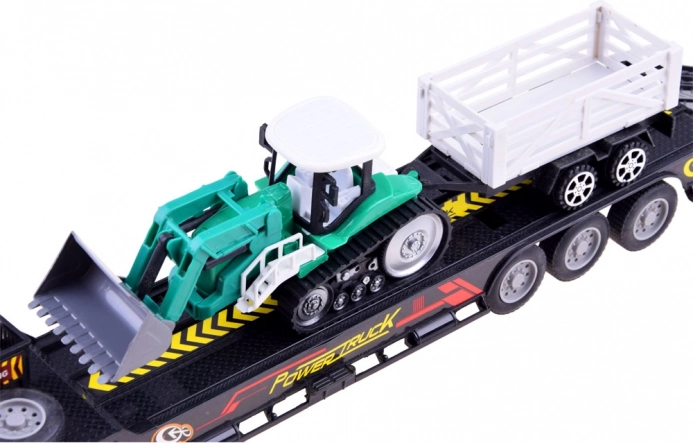 Naczepa niskopodwoziowa bezpiecznie przewiezie traktor z przyczepą. Detalne wykonanie i solidny plastik zapewniają długą trwałość podczas zabawy.