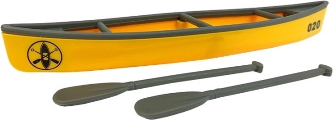 W zestawie znajduje się żółto‑szary kajak i dwa wiosła. Łatwo przymocujesz go do dachu auta i wyruszysz na wodne misje w dziecięcej wyobraźni.