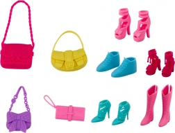 W zestawie znajduje się kolekcja modowych dodatków, w tym buty i torebki w żywych kolorach, takich jak różowy, żółty, turkusowy i fioletowy.