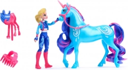 Lalka Isabel jest wyposażona w siedem punktów zgięcia dla dynamicznych pozycji, a jednorożec River ma niebiesko-różową grzywę i ogon.
