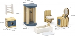 Miniaturowe meble są dopasowane do standardowych domków; poszczególne elementy łatwo uporządkujesz. Przykładowe wymiary: umywalka 3 × 3 × 6 cm, szafka 2 × 3 × 2,8 cm, prysznic 4 × 4,5 × 7,22 cm.