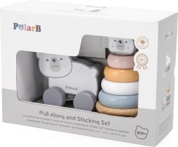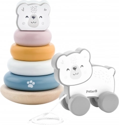 Odkryj doskonale skomponowany zestaw drewnianych zabawek Viga PolarB: stabilną piramidę z niedźwiedziem polarnym do sortowania i układania krążków oraz misia na sznurku, który motywuje dzieci do ruchu i pierwszych kroków. Delikatne pastelowe kolory i miły design spodobają się dzieciom i rodzicom.