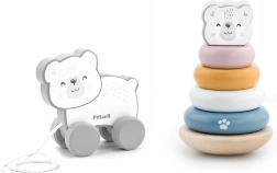 Stylowy zestaw marki Viga z kolekcji PolarB zawiera dwie pastelowe drewniane zabawki: edukacyjną piramidę z niedźwiedziem polarnym oraz urocze ciągnięte po podłodze misiu. Wspiera motorykę małą, myślenie logiczne, koordynację ręka–oko oraz naukę kolorów, a jednocześnie zapewnia codzienną zabawę.