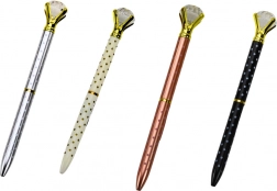 Elegancki długopis kulkowy z dużym lśniącym „diamentem” w górnej części doda Twojemu pisaniu stylu i szyku. Delikatny niebieski tusz oraz końcówka 0,7 mm zapewniają gładkie i płynne pisanie. Dostępny w mixie kolorów – białym, czarnym, srebrnym i pudrowo różowym.