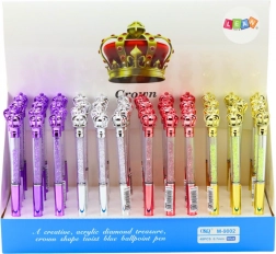 Elegancki długopis kulkowy z dekoracyjną koroną i przezroczystym korpusem wypełnionym błyszczącymi kryształkami. Oferuje niebieski tusz, końcówkę 0,7 mm dla płynnego pisania oraz luksusowy wygląd na co dzień i na prezent. Dostępny w mixie kolorów.
