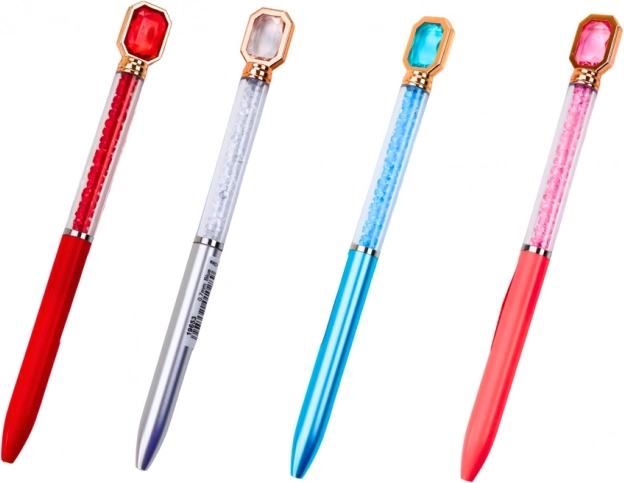 Elegancki długopis kulkowy z przezroczystym korpusem wypełnionym błyszczącymi kamyczkami i subtelnym kryształem na końcu. Niebieski atrament zapewnia gładkie i płynne pisanie, idealny na co dzień i jako prezent. Dostępny w miksie kolorów korpusu (różowy, niebieski, czerwony, srebrny).