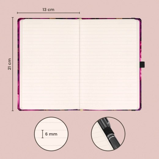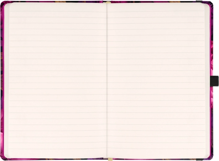 Stylowy notes NOTIQUE w linie z fioletowymi kwiatami, 13x21 cm, wysokiej jakości papier, twarda okładka, wewnętrzna kieszeń, pętla na długopis.