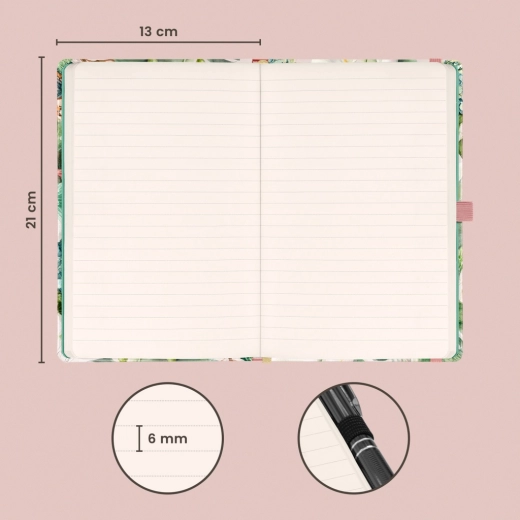 Praktyczna pętelka na długopis i wewnętrzna kieszeń na drobiazgi sprawdzą się w podróży i w biurze. Kartki w linie z delikatnie żółtego papieru zapewniają przyjemny kontrast i wygodę czytania nawet podczas dłuższego pisania.