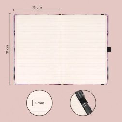 Elegancki notes w linie NOTIQUE Sakura w praktycznym formacie 13 × 21 cm z twardą okładką, zapięciem na gumkę, pętelką na długopis oraz wewnętrzną kieszenią. Oferuje 172 strony z przyjemnego żółtego papieru do dziennika i notatek służbowych.