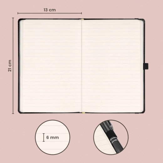Elegancki notes NOTIQUE w twardej oprawie z gumką do zamykania, uchwytem na długopis i wewnętrzną kieszonką. Oferuje 172 strony na przyjemnym żółtym papierze na wszystkie pomysły, zapiski w dzienniku i notatki służbowe. Kompaktowy rozmiar 13 × 21 cm mieści się w torebce i plecaku.