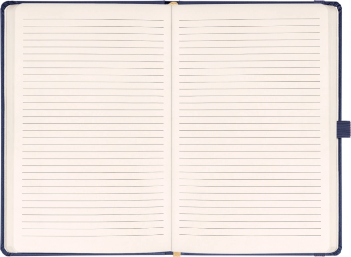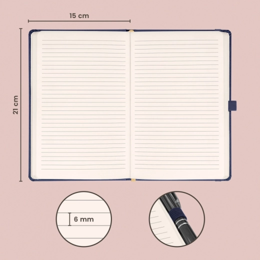 Elegancki liniowany notes o wymiarach 15 × 21 cm w granatowym wykończeniu. Trwała powierzchnia z balacronu niezawodnie chroni przed uszkodzeniami zewnętrznymi – idealny do pracy, szkoły i w podróży.