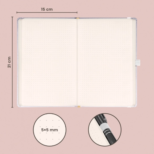 Dzięki uniwersalnemu formatowi 15 × 21 cm mieści się do większości toreb i plecaków, więc możesz mieć go zawsze przy sobie. Kropkowana liniatura ułatwia przejrzyste planowanie, tworzenie tabel oraz precyzyjne schematy notatek bez rozpraszających, pełnych linii.