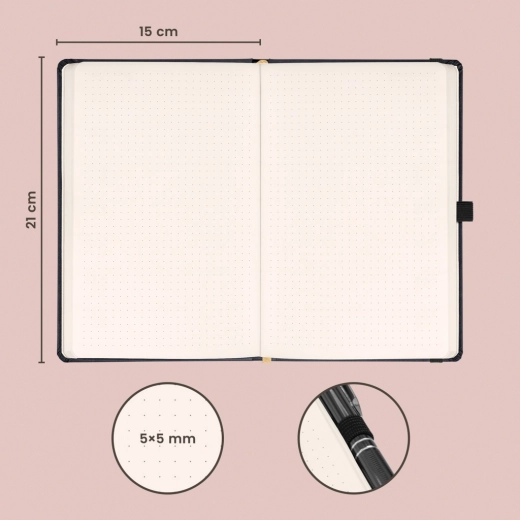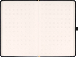 Punktowa siatka zapewnia elastyczność do pisania, rysowania i tworzenia przejrzystych układów. Powierzchnia dodatkowo nadaje się do tłoczenia logo, więc notes z łatwością zamienisz w stylowy firmowy upominek lub materiał prezentacyjny.