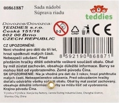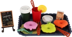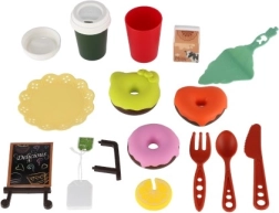 W zestawie znajduje się ozdobna niebieska taca, filiżanka do kawy, mały dzbanuszek, butelka/kubeczek, pojemnik na mleko, sztućce oraz różne słodkie smakołyki. Zestaw doskonale rozwija umiejętności społeczne, komunikację i wyobraźnię podczas zabawy z przyjaciółmi.