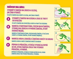 Skaczące żabki QUIZY to prosta i wciągająca gra dla dzieci i dorosłych. Za pomocą palca lub dołączonej płytki podbijasz plastikowe żabki tak, aby wskoczyły do wyznaczonej strefy. Zasady opanujesz w mgnieniu oka, ale precyzyjne skoki wymagają odrobiny wprawy – idealne do przyjaznej rywalizacji i rodzinnego popołudnia.