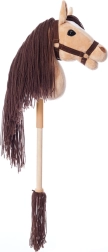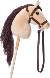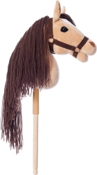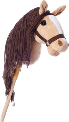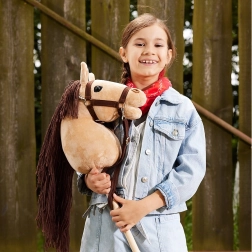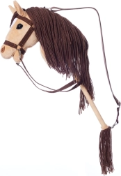 Konik na biegunach ma realistyczny wygląd z miękką pluszową głową i drewnianym kijem, co pozwala dzieciom symulować jazdę konną.