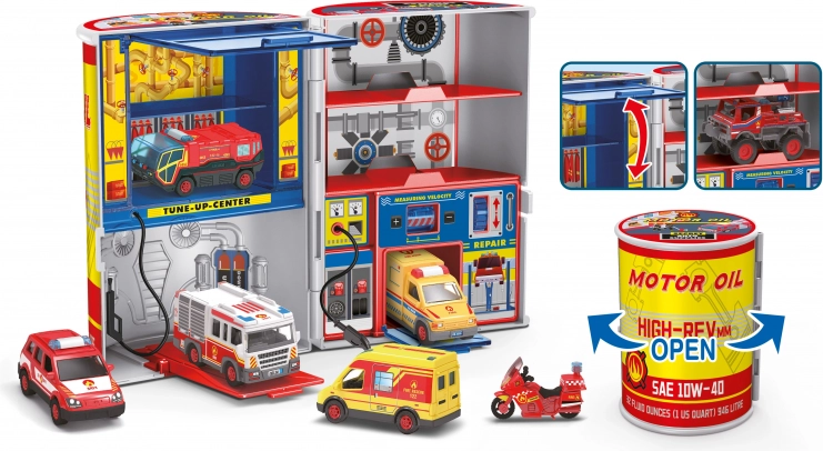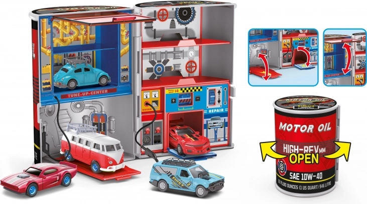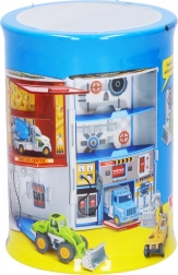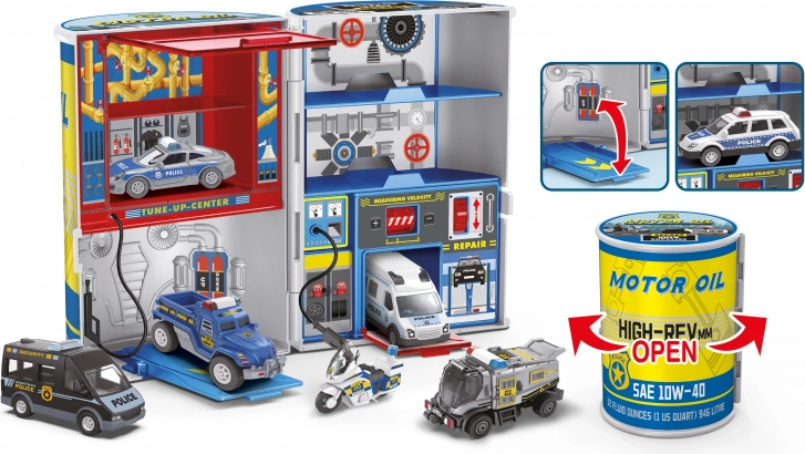 Ten serwis samochodowy to idealny prezent dla każdego małego miłośnika aut. Dostarczany jest z jednym metalowym autem i oferuje cztery różne warianty: policyjny, strażacki, budowlany i wyścigowy. Wszystkie pojazdy mają swobodne koła, co zapewnia łatwe manewrowanie.