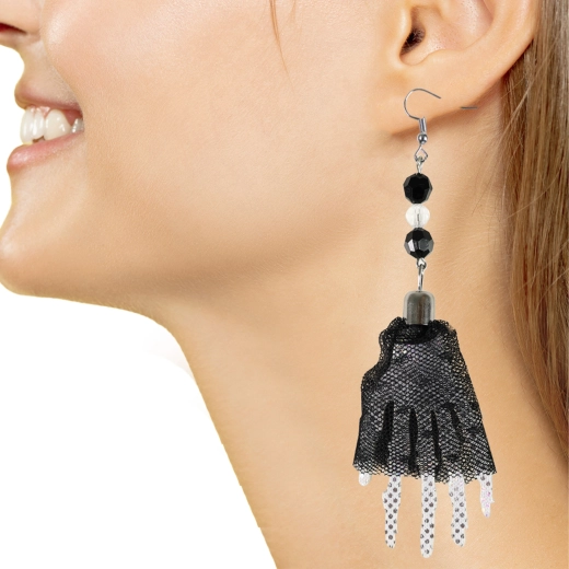 Dodaj swojemu kostiumowi odrobinę upiornego blasku. Te kolczyki z motywem dłoni czarownicy/szkieletu mają delikatne brokatowe drobinki, które pięknie mienią się w świetle i dopełnią każdy halloweenowy strój – od czarownicy po kościotrupa.