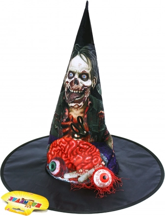 Straszny kapelusz na Halloween z mózgiem i okiem. Idealny dodatek do kostiumu dla wieku 14+. Lekki, wyrazisty i zabawny na każdą imprezę.