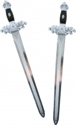 W skład zestawu wchodzą 2 identyczne srebrne miecze o długości 49 cm z dekorowanymi rękojeściami – idealne do pojedynku lub zabawy w duecie.