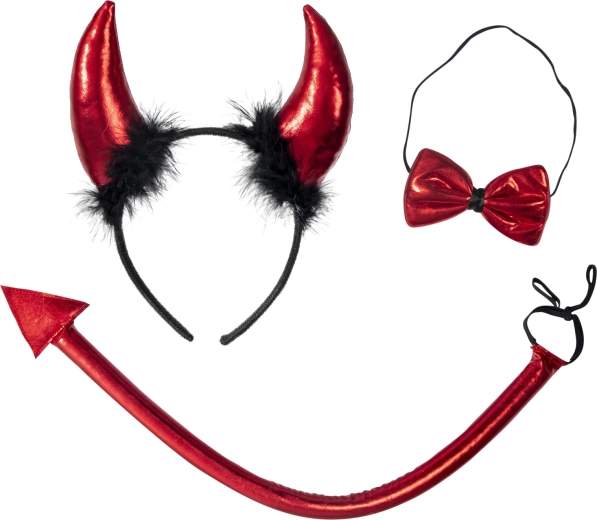 Uroczy diabelski zestaw dla dzieci zawiera opaskę z rogami, ogon oraz różdżkę w kształcie wideł – idealny dodatek na mikołajkową imprezę. Perfekcyjny na mikołajkowe prezenty, karnawał i dziecięce kostiumy.