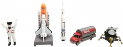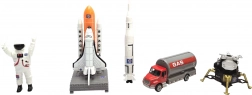 - Figurka kosmonauty, rakieta, prom kosmiczny na platformie startowej, moduł księżycowy, samochód‑cysterna