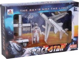 - Kompletna misja kosmiczna: kosmonauta, rakieta, prom kosmiczny na platformie, moduł księżycowy, samochód‑cysterna