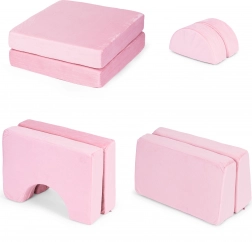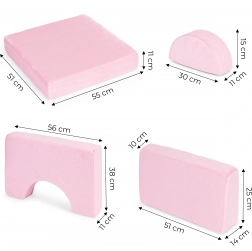 Każdy element wykonany jest z miękkiej i sprężystej pianki, która przyjemnie dopasowuje się do ciała. Pokrowce są miłe w dotyku, odporne na codzienne zużycie i dzięki zamkowi można je łatwo zdjąć i wyprać. Lekka konstrukcja pozwala dzieciom samodzielnie przenosić i układać elementy.