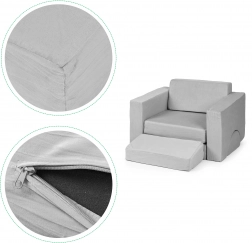 Dzięki lekkim poduszkom ze zdejmowanymi pokrowcami na zamek bez trudu utrzymasz mebel w czystości. Neutralny szary design wpasuje się zarówno do pokoju dziecięcego, jak i bawialni, a wysokiej jakości materiały wytrzymają codzienne użytkowanie.