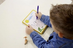 Napełnij pisak wodą, przeciągnij po stronie, a obrazki ożyją kolorami. Po wyschnięciu (ok. 10 minut) znikają i możesz zacząć od nowa.