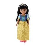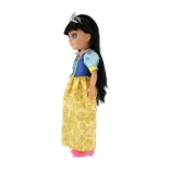 Lalka ma długie czarne włosy, niebieskie oczy i nosi piękną suknię w niebiesko-żółtej kombinacji oraz różowe buty.