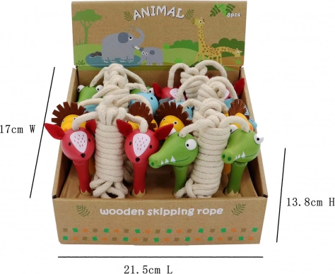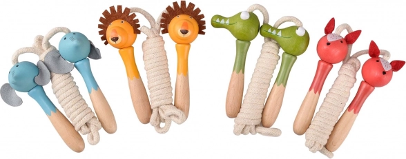 Drewniana skakanka ze zwierzątkami o długości 210 cm z wygodnymi drewnianymi uchwytami w motywach słoń, lew, krokodyl, lis. Świetna zabawa i trening koordynacji do zabawy na dworze i w domu.