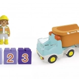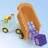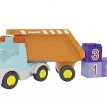 Ten kolorowy zestaw konstrukcyjny zachwyci małych kierowców i przyszłych kierowników budowy. Dzieci mogą ładować „kamienie” przez otwartą tylną część skrzyni, wysypywać zawartość dzięki uchylnemu nadwoziu i w kółko powtarzać zabawny cykl załadunku i rozładunku. Trzy ponumerowane klocki (1, 2, 3) naturalnie rozwijają podstawy liczenia i sortowanie kolorów.