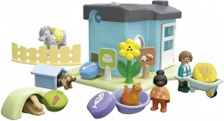 Zestaw wspiera pierwsze poznawanie świata zwierząt – gdzie lubią odpoczywać, co jedzą i jak się o nie troszczyć. Otwierane drzwi, obracany dach, znaki i kwiaty pobudzają wyobraźnię i dostarczają nowych scenariuszy zabawy. Dzieci mogą pchać taczkę, ładować i rozładowywać, sortować karmę oraz wymyślać historie o tym, czy hotel jest otwarty czy zamknięty i czy karmy jest jeszcze dość.