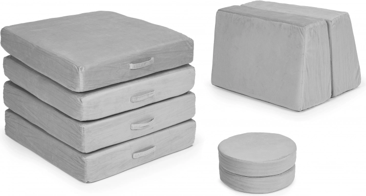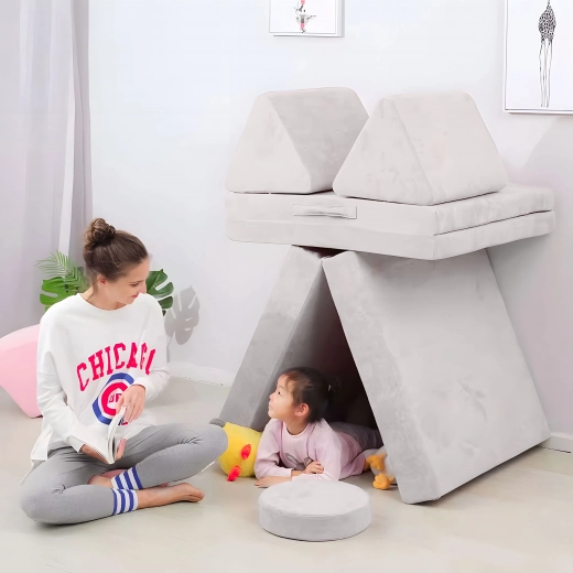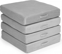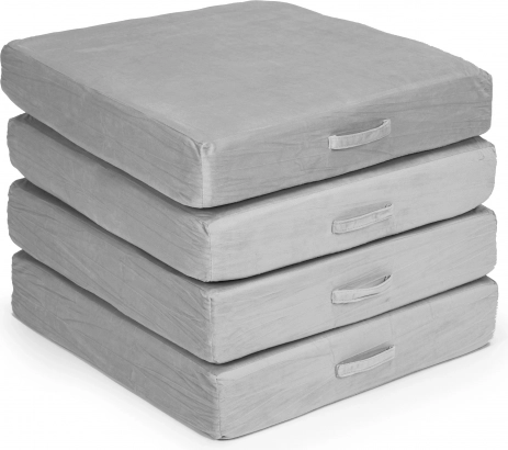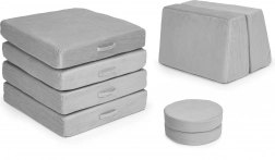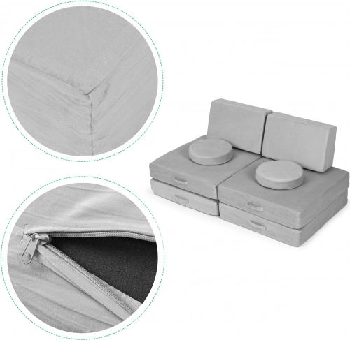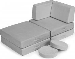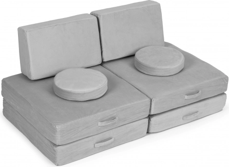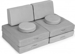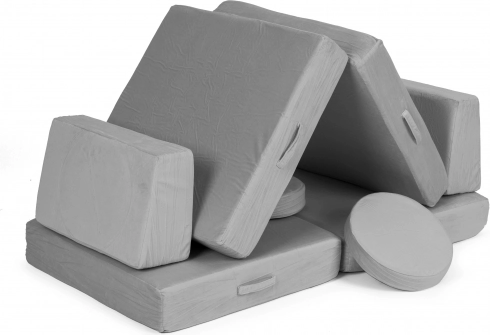 Dzięki lekkim elementom z uchwytami dzieci mogą samodzielnie przenosić i układać mebel. Zdejmowane pokrowce na zamek ułatwiają pielęgnację – wystarczy je zdjąć i wyprać. Neutralne szare wykończenie świetnie wpisze się w nowoczesne wnętrza i zniosie codzienne użytkowanie.