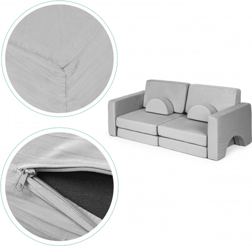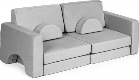 Praktyczne zamki w pokrowcach umożliwiają szybkie zdejmowanie i pranie, dlatego sofa jest idealna do pokojów dziecięcych i kącików zabaw. Przyjemna w dotyku tkanina jest miękka, a jednocześnie odporna na codzienne użytkowanie. Uniwersalna szarość świetnie komponuje się z nowoczesnymi wnętrzami.