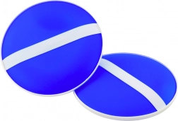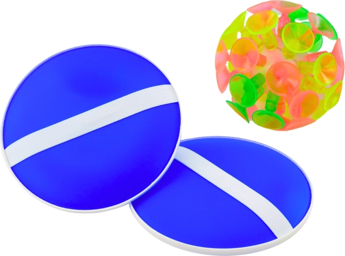 Gra zawiera dwie okrągłe niebieskie pałki z przyssawkami oraz jedną lekką piłkę, idealną do dynamicznej gry na świeżym powietrzu.