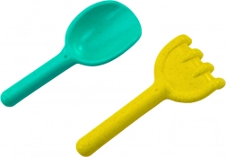 Ten kompletny zestaw do piasku jest idealny dla małych budowniczych. Centrum stanowi młynek do piasku z dwoma kołami – na górze znajduje się sitko do przesiewania piasku, a z drugiej strony lejek do zabawnych eksperymentów z wodą i piaskiem. W komplecie są również praktyczne narzędzia: łopatka do nabierania i przenoszenia oraz grabki do formowania i wygładzania.