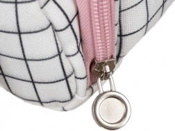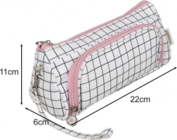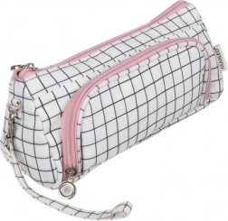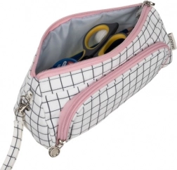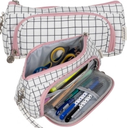 Dla jeszcze lepszej organizacji piórnik posiada przegrodę z siateczką, która oddziela główną przestrzeń od przedniej klapki. Przednia klapka ma własny zamek błyskawiczny, co ułatwia szybki dostęp do jej zawartości bez konieczności otwierania głównej części. Obecność pięciu gumowych uchwytów zapewnia łatwy dostęp do często używanych narzędzi.