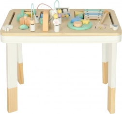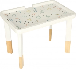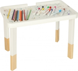 Stolik wykonano z wysokiej jakości drewna z zaokrąglonymi krawędziami i pokryto nietoksycznymi farbami. Spełnia europejskie normy bezpieczeństwa (CE). Dzięki praktycznemu blatowi łatwo wykorzystasz go także jako miejsce do pisania, rysowania i kreatywnej twórczości.