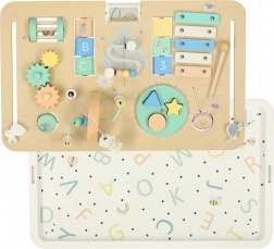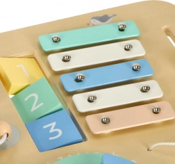Ksylofon, sorter kształtów, zębate kółka z suwakami i koralikowy labirynt na długo zajmują dzieci i naturalnie rozwijają małą motorykę oraz logiczne myślenie.