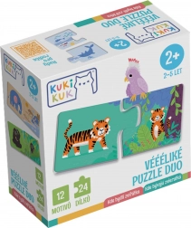 Véééliké puzzle duo: gdzie mieszkają zwierzątka to zabawna gra edukacyjna, w której dzieci wyszukują i układają właściwe pary zwierzęcia i jego domu. Specjalny kształt złączy umożliwia połączenie wyłącznie poprawnych obrazków, dzięki czemu dzieci uczą się naturalnie poprzez zabawę i od razu widzą efekt.