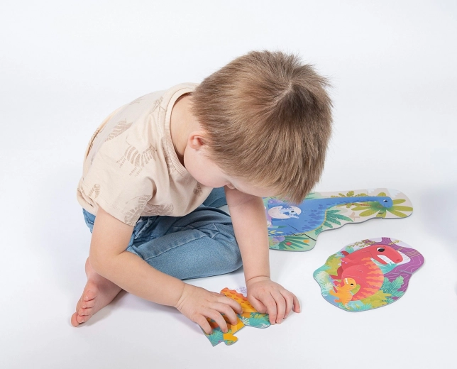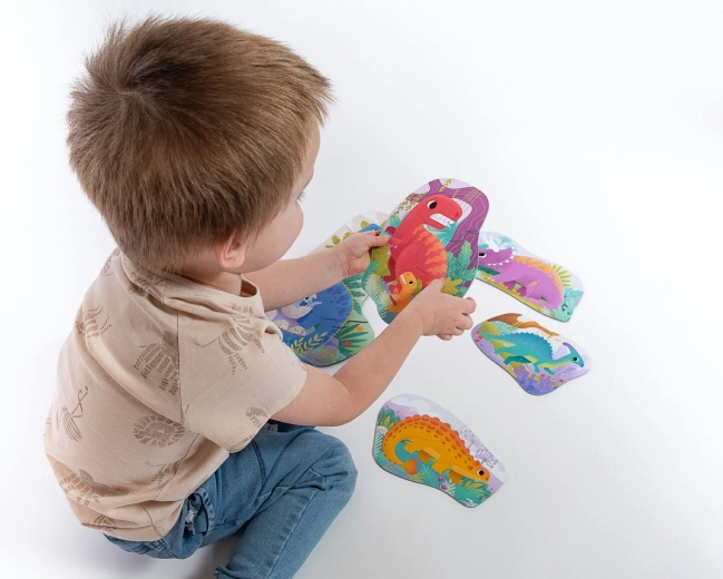 Każdy dinozaur to osobne puzzle z uproszczonym kształtem. Dzieci ćwiczą układanie, a przy tym odkrywają świat prehistorycznych stworzeń.