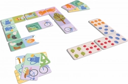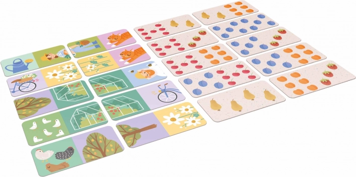 Gra oferuje dwa warianty w jednym: domino obrazkowe z motywami z ogrodu (zwierzęta, ogrodnicy i narzędzia) oraz klasyczne domino, w którym kropki zastępują różne owoce. Dzięki dużym, wytrzymałym elementom 12 × 6 cm gra nadaje się również dla młodszych dzieci i wspiera naukę poprzez zabawę.