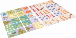 - 28 dwustronnych kart z motywami ogrodu i owocowymi kropkami, wskazówki dotyczące wariantów gry