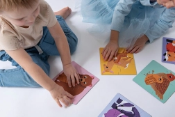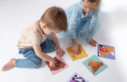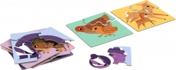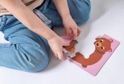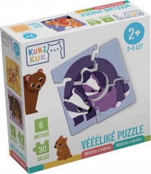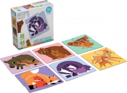 Ten zestaw zawiera sześć kwadratowych puzzli z ilustracjami zwierzęcych rodzin – niedźwiedź, lis, borsuk, dzik, sarna i ptaszek. Każdy motyw składa się z czterech dużych elementów o finalnym rozmiarze ok. 15,5 × 15,5 cm. Jednakowe kształty łączących zamków prowadzą dzieci do systematycznego próbownia i właściwego dopasowywania, przy czym środkowe elementy maluchów mają we wszystkich motywach taki sam kształt.
